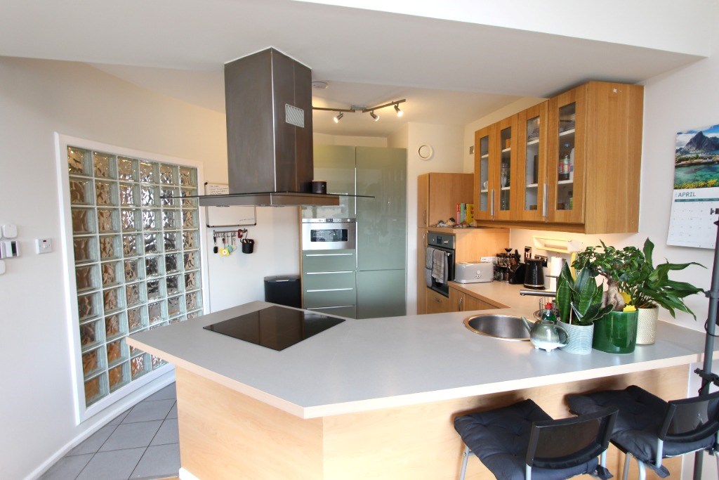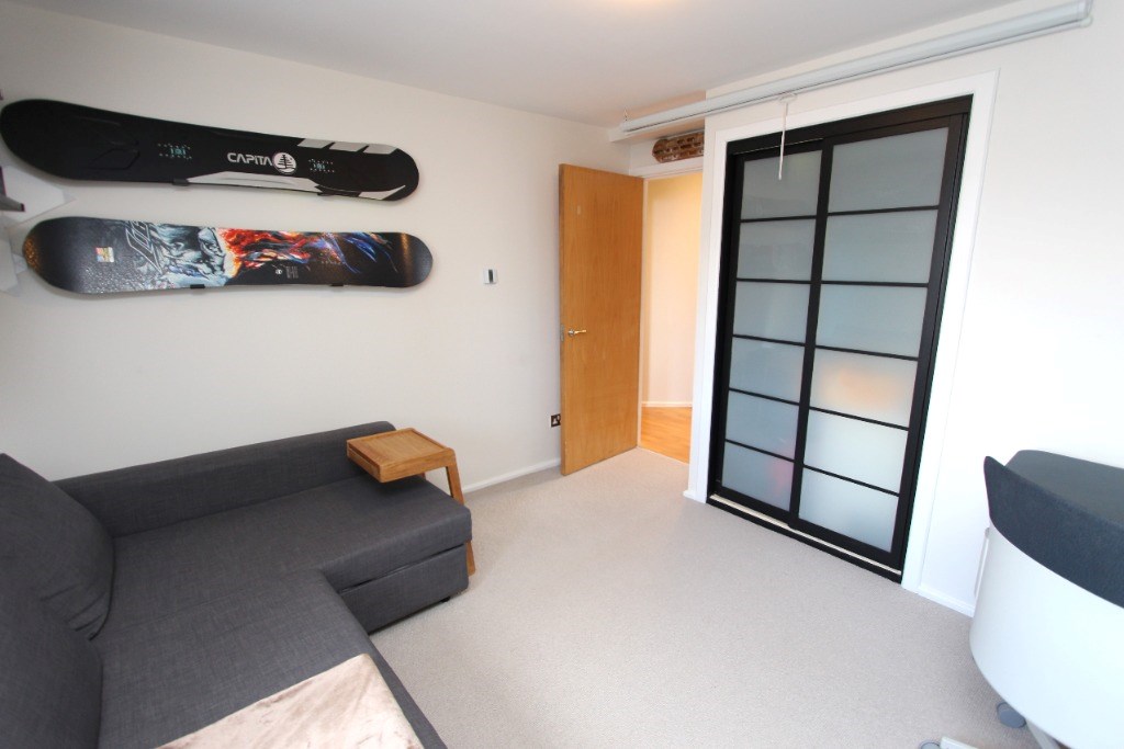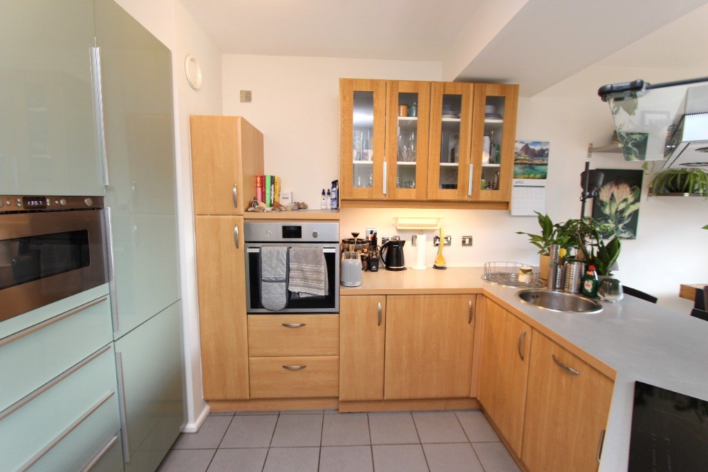 Bright and generously proportioned living/dining room area adjoined to a modern kitchen with integrated appliances and ample storage space in high and low units. Large double bedroom with mirrored wardrobes, further double bedroom which could be used as a bedroom or home office, a tiled family bathroom with shower over bath.