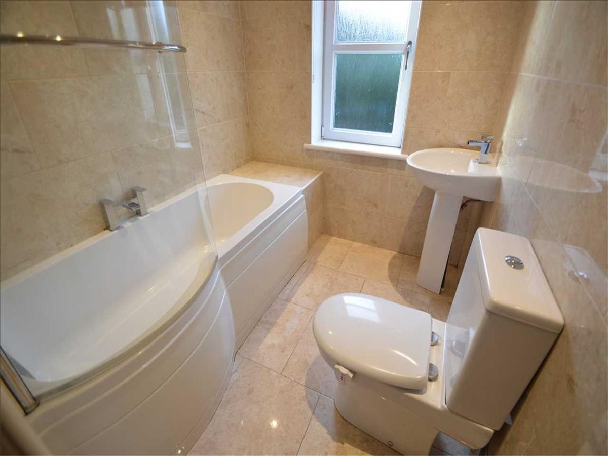 How about a sleek and modern, fully tiled white bathroom, with P shaped bath, glass shower screen and matching chrome accessories?