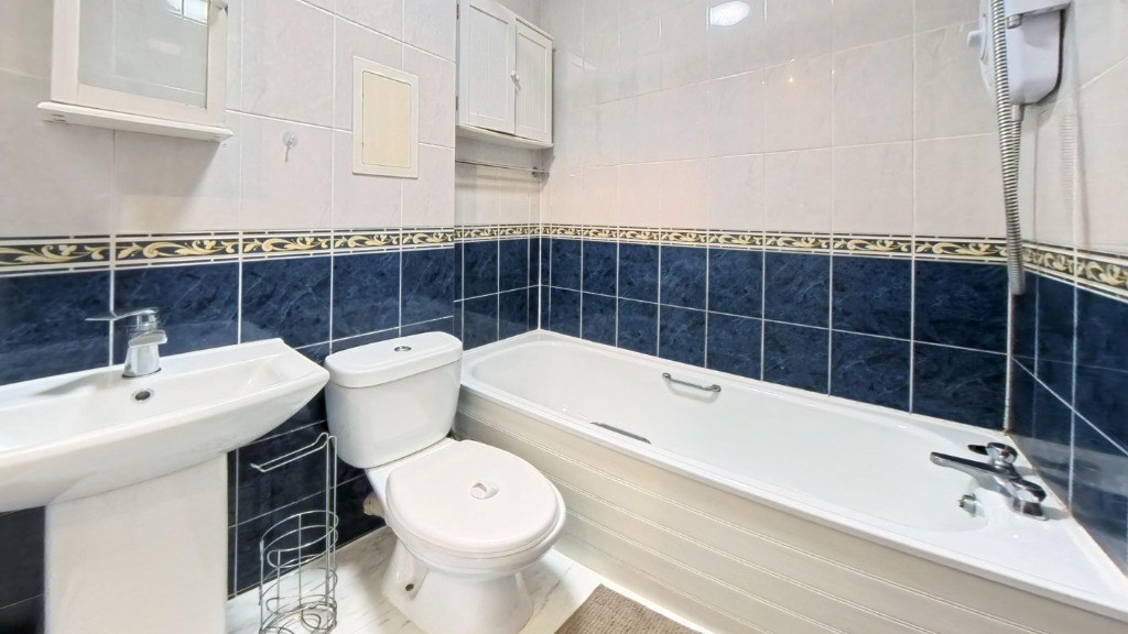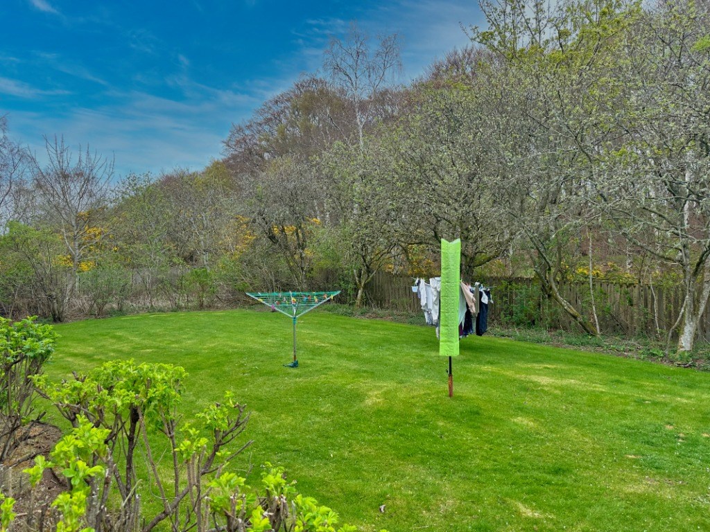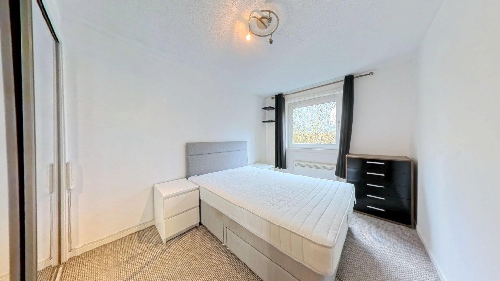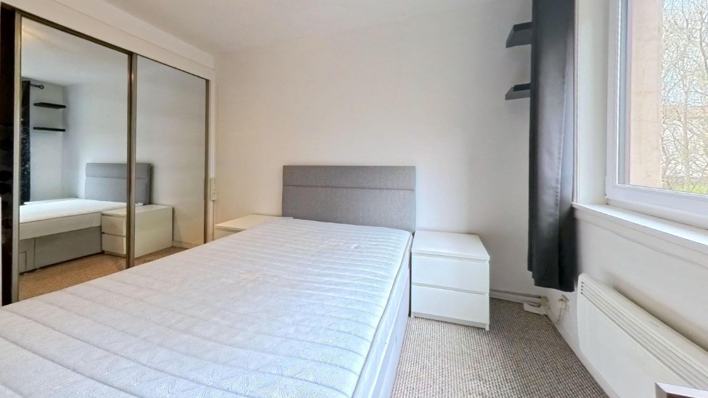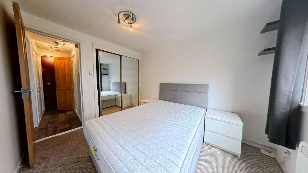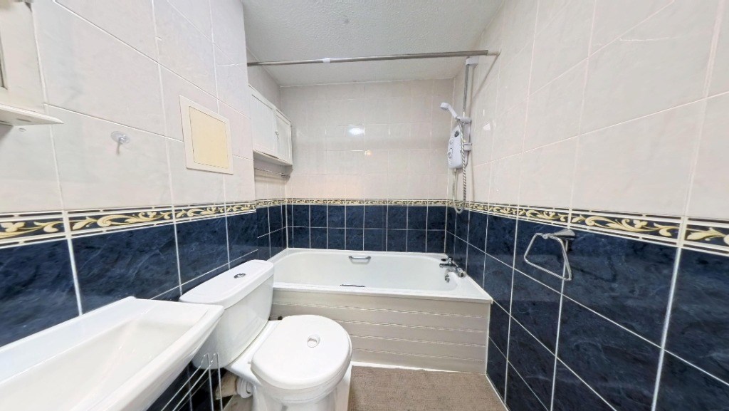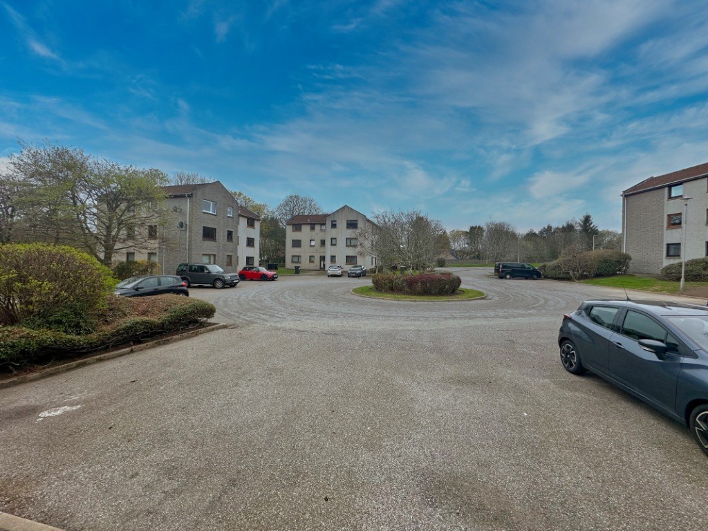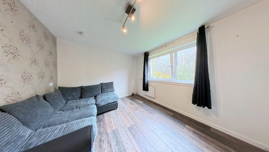 Located at 24 Dubford Park, Aberdeen, this one-bedroom, one-bathroom flat offers a well-organised layout across a single floor totalling 29 square metres. The living room features light wood-effect laminate flooring, a large window with garden views, and a charming floral feature wall that adds character to the bright, neutral space. The kitchen is fitted with white cabinetry, dark slate-effect tiled splashbacks, and grey worktops, and is equipped with an integrated electric hob, oven, extractor hood, and a freestanding washing machine. Wood-effect flooring continues throughout, and a window allows natural light into the space. The bedroom spans 8 square metres and is carpeted, featuring a window with tree-lined views, wall-mounted shelving, and built-in wardrobe access. The bathroom is tiled in a classic navy and white combination with a decorative border, and includes a full-sized bathtub, WC, and pedestal basin with overhead storage. A connecting hallway links all rooms efficiently, contributing to the flat's practical and functional flow throughout. EPC rating: C. Landlord Registration Number: 1464959/100/24082. Letting Agent Registration Number: 1811019.