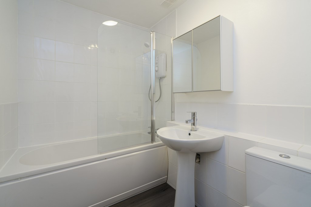 BATHROOM Modern three-piece white suite with shower over bath. Mirrored vanity unit provides a good amount of storage, Complete with white tiled walls and dark brown flooring.
