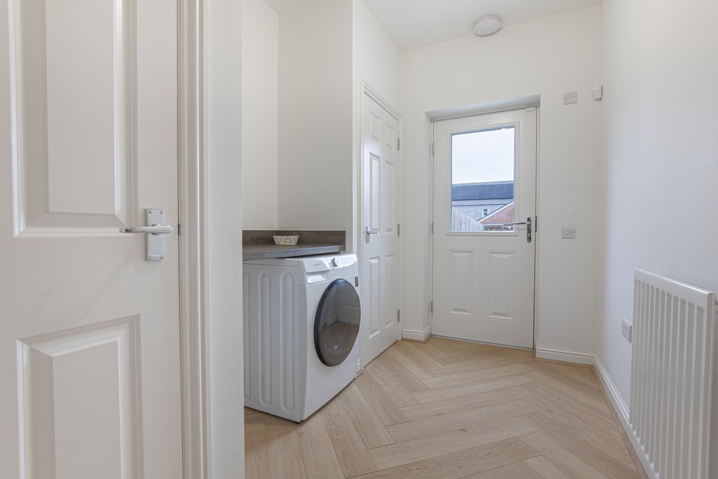 UTILITY ROOM The property is accessed via a bright and welcoming hallway completed with high quality herringbone wooden flooring which flows through to the convenient utility room. This provides the perfect area for laundry with the addition of a washer-dryer without intruding on living space. Built-in storage is available within two sizeable cupboards. The rear garden is also accessed from here complete with a picnic bench & two private parking spaces.