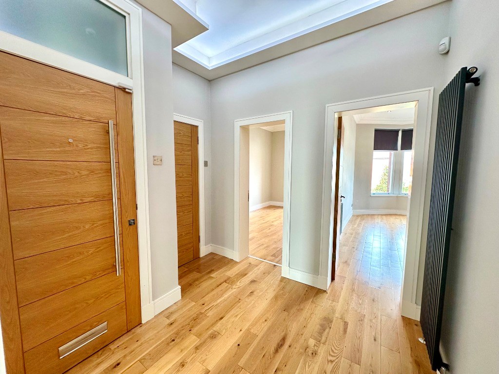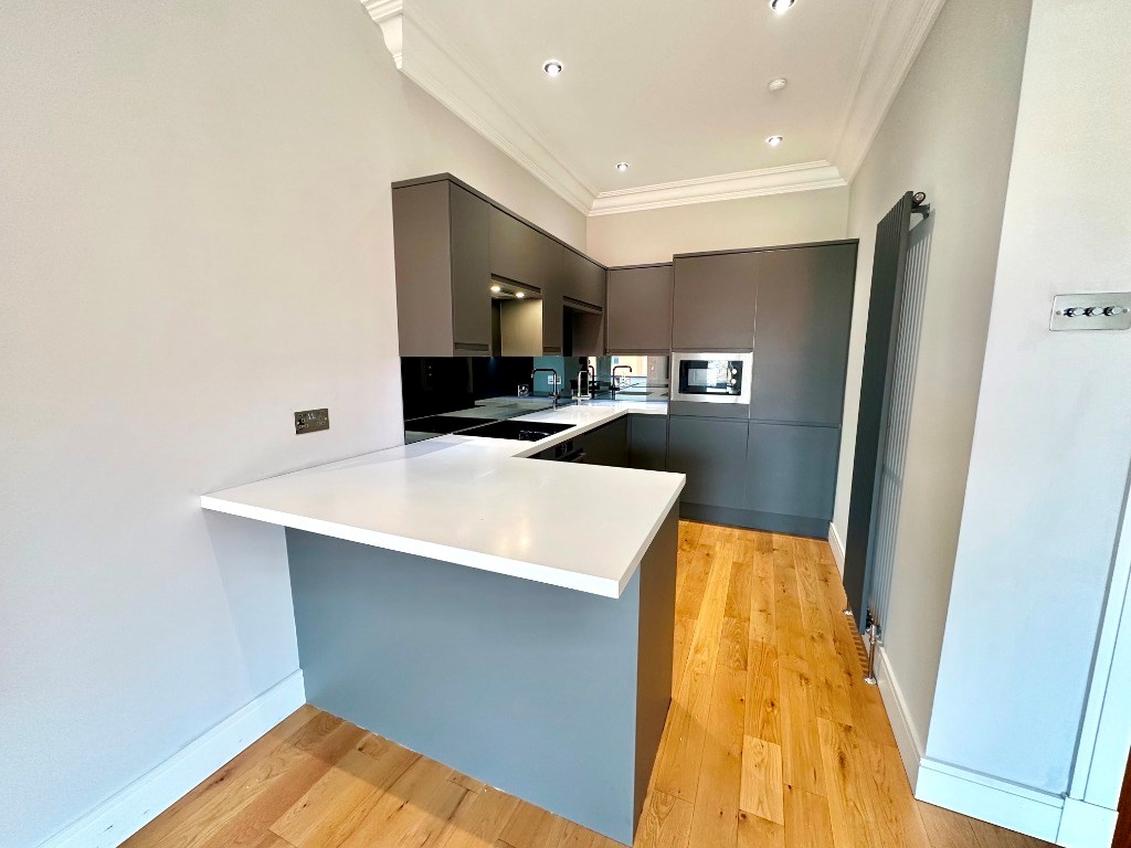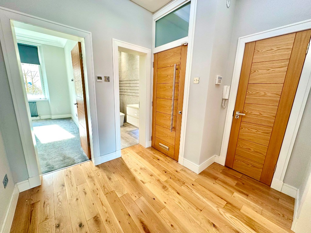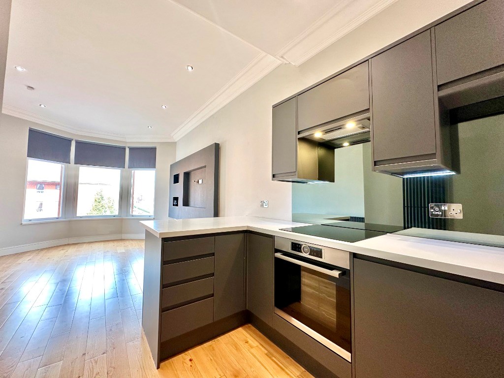 The building is entered into via a very well kept communal close and the stairs lead up to the property on the first floor. Internally the accommodation comprises of welcoming entrance hallway with storage cupboard off and hidden ceiling lighting giving the feeling of natural daylight in this room. There are two great sized double bedrooms, one having hardwood flooring and the other with carpet as well as fitted wardrobes. The spacious and bright living room is open plan to. the kitchen and features hardwood flooring, a bay window which floods the room with natural light and a feature media wall. The ultra modern kitchen has a range of wall and floor mounted matt grey units with contrasting white worktops merging into a breakfast bar and the property comes complete with integrated appliances which include a Bosch fridge freezer, AEG washer dryer, Bosch dishwasher, Bosch induction hob and Bosch built-in electric oven. Additionally there is also an integrated microwave and the very handy Insinkerator boiling water tap eliminating the need for a kettle. Finally, the shower room is fully tiled with modern grey tiles and features modern white ceramics with a wet room style shower area with mains powered shower to the rear of the room. The shower room is further enhanced by having a Thermonet under floor heating system with control panel in the hall.