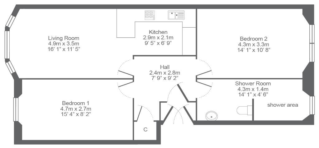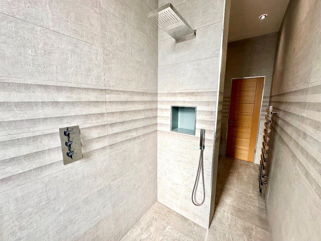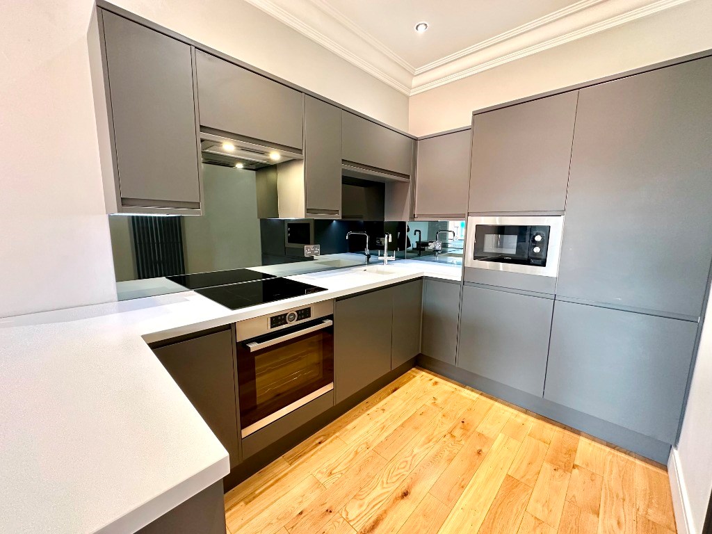 The building is entered into via a very well kept communal close and the stairs lead up to the property on the first floor. Internally the accommodation comprises of welcoming entrance hallway with storage cupboard off and hidden ceiling lighting giving the feeling of natural daylight in this room. There are two great sized double bedrooms, one having hardwood flooring and the other with carpet as well as fitted wardrobes. The spacious and bright living room is open plan to. the kitchen and features hardwood flooring, a bay window which floods the room with natural light and a feature media wall. The ultra modern kitchen has a range of wall and floor mounted matt grey units with contrasting white worktops merging into a breakfast bar and the property comes complete with integrated appliances which include a Bosch fridge freezer, AEG washer dryer, Bosch dishwasher, Bosch induction hob and Bosch built-in electric oven. Additionally there is also an integrated microwave and the very handy Insinkerator boiling water tap eliminating the need for a kettle. Finally, the shower room is fully tiled with modern grey tiles and features modern white ceramics with a wet room style shower area with mains powered shower to the rear of the room. The shower room is further enhanced by having a Thermonet under floor heating system with control panel in the hall.