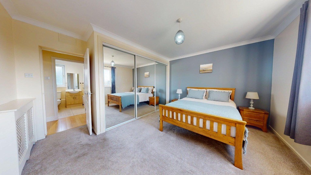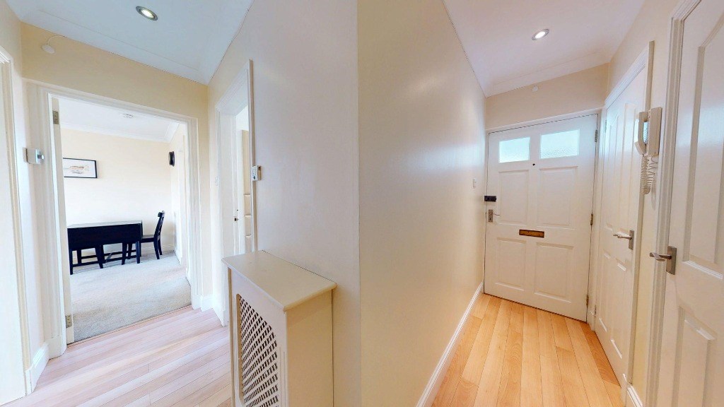 A small hallway connects the rooms, with a radiator cover adding a decorative touch. The apartment's neutral colour palette, accented with pops of purple and blue, creates a cohesive and inviting ambiance throughout the space.