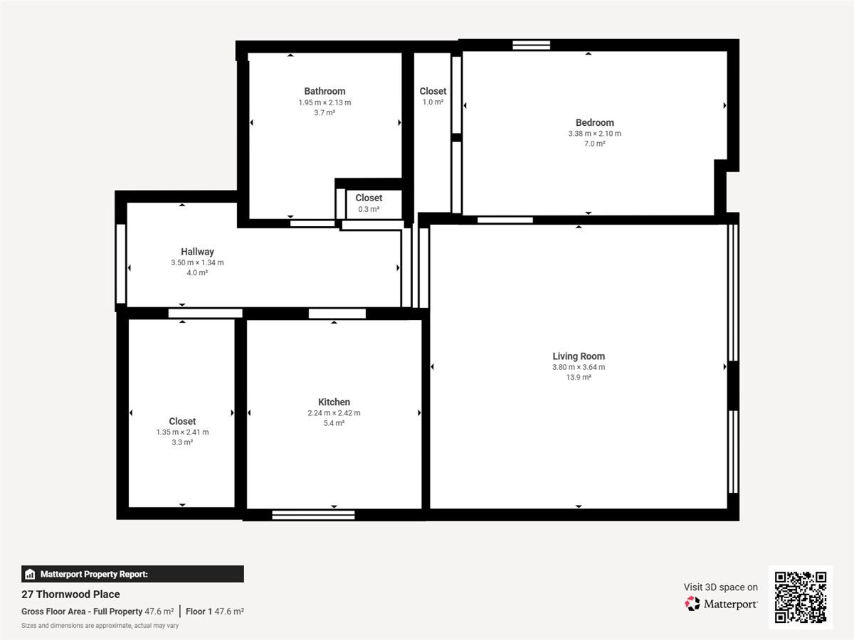Entrance hallway with large storage cupboard, Bright living room with juliet balcony door, bedroom off living room with fitted wardrobe space, modern kitchen with all appliances provided, and shower room