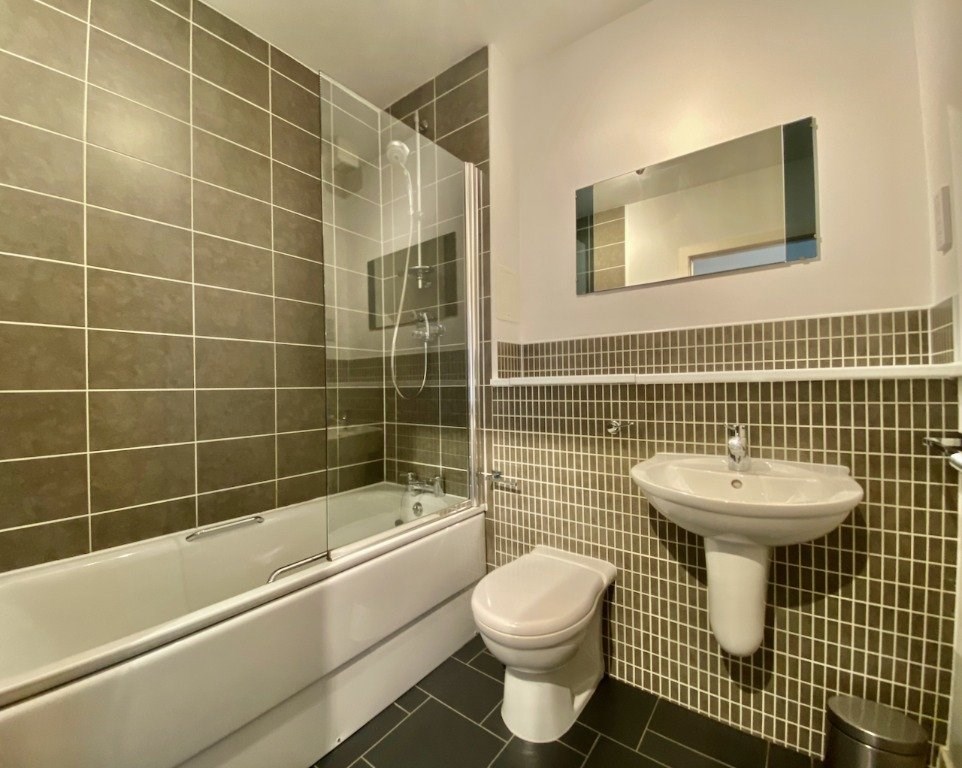 the bright bedroom is complete with fitted wardrobes and the modern bathroom has a bath with shower over.