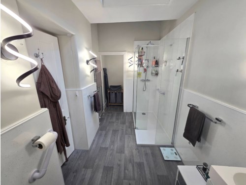 - Modern bathroom with walk-in shower enclosure and dual head shower system.?