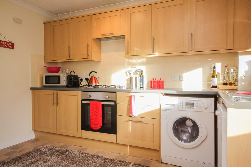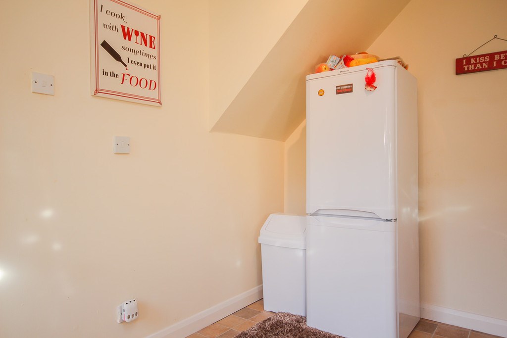 The fully fitted kitchen has a gas hob, electric oven, fridge/ freezer and washing machine and is situated to the rear.