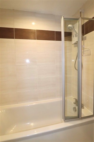 The contemporary family bathroom is fitted with an electric shower over the bath.