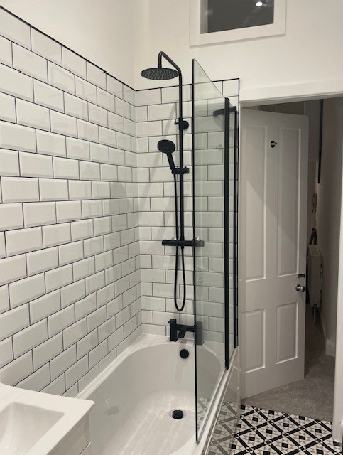 ~Communal bathroom with tiled splashback and sprinkler shower over bath