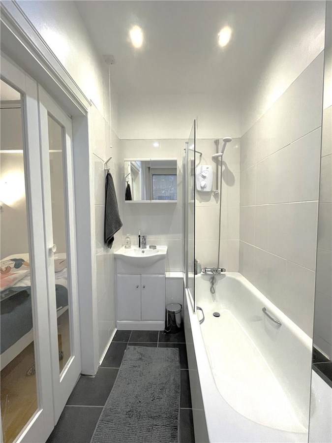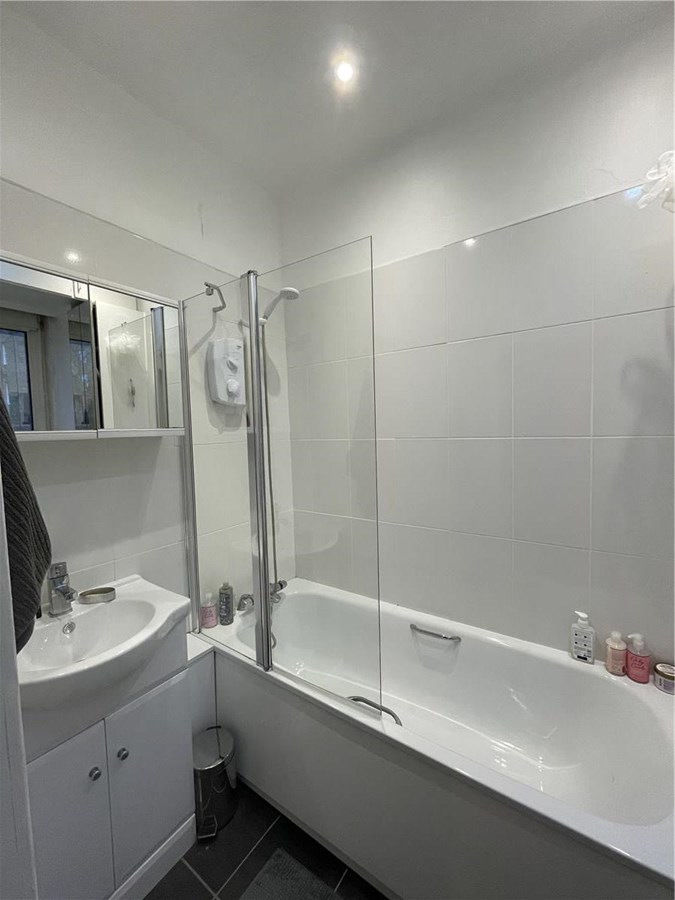 BATHROOM - en-suite off bedroom, with white basin and bath.