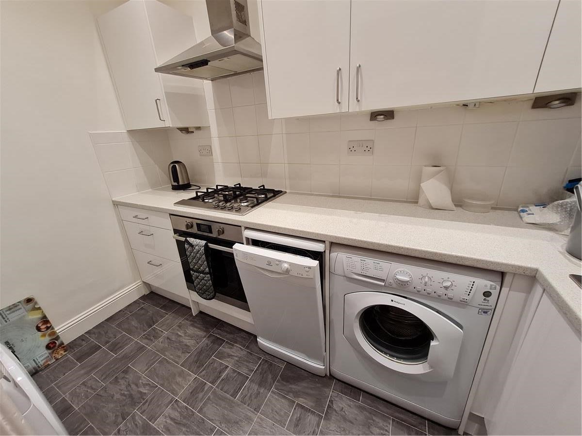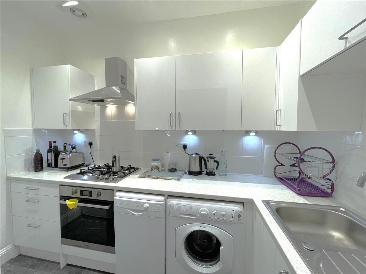 KITCHEN - smallish but fully-equipped separate kitchen with white gloss units, dishwasher, tumble dryer, fridge-freezer, washing machine, microwave, gas hob, electric oven. Tile-effect floor.