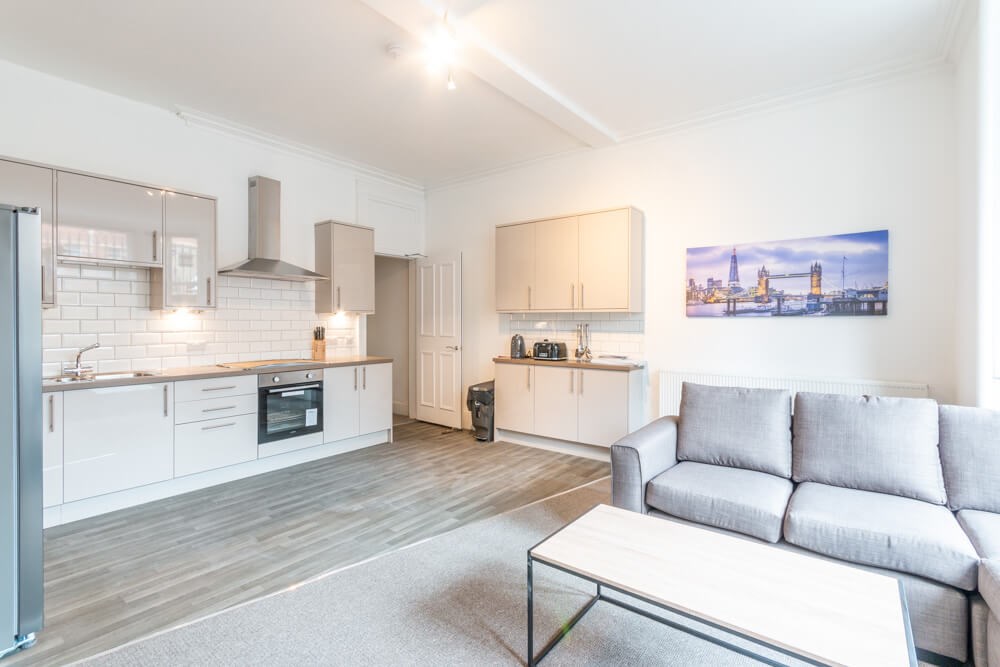 ~Impressive, open-plan lounge/kitchen area with large, front-facing bay window, brand new kitchen, selection of appliances and tiled splashback
