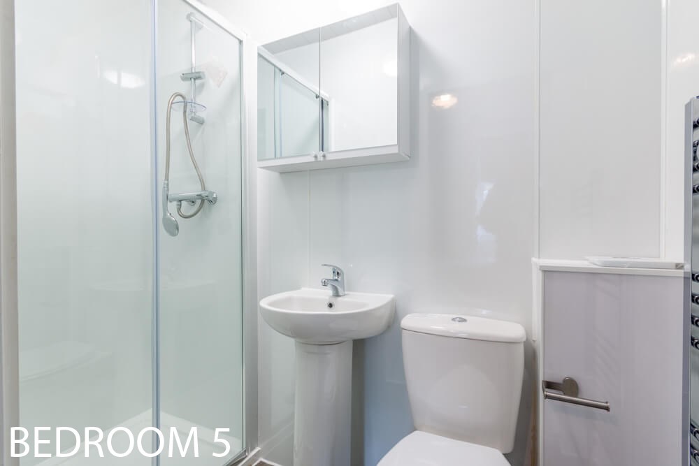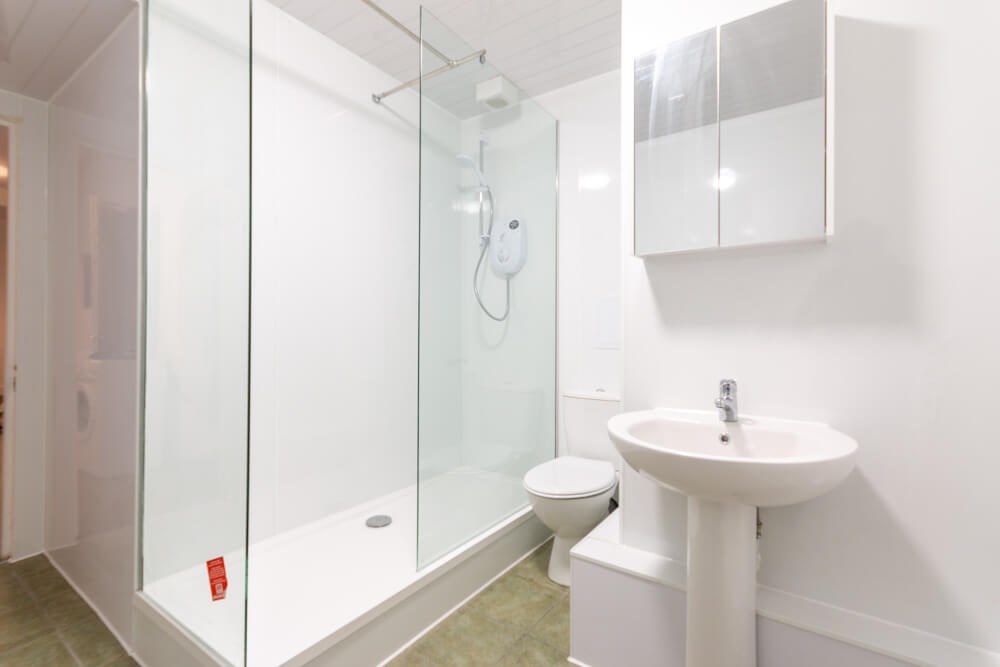 ~Spacious, communal shower room with double shower cubicle and stylish three-piece suite