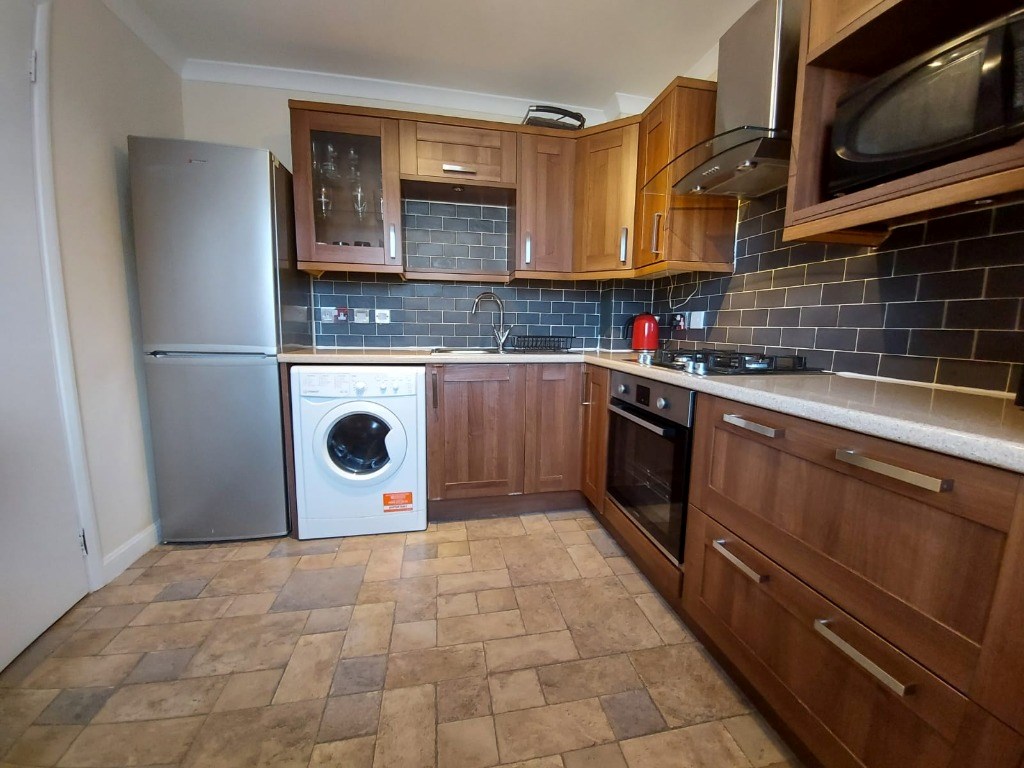 The property comprises of; Entrance Hallway with storage cupboards, Lounge with brown leather effect sofas, Kitchen, complete with all essential appliances including gas hob and washer dryer. This also benefits from a breakfast bar dining area. There are two double bedrooms, both with built in wardrobes. The bathroom features a mains shower over the bath.