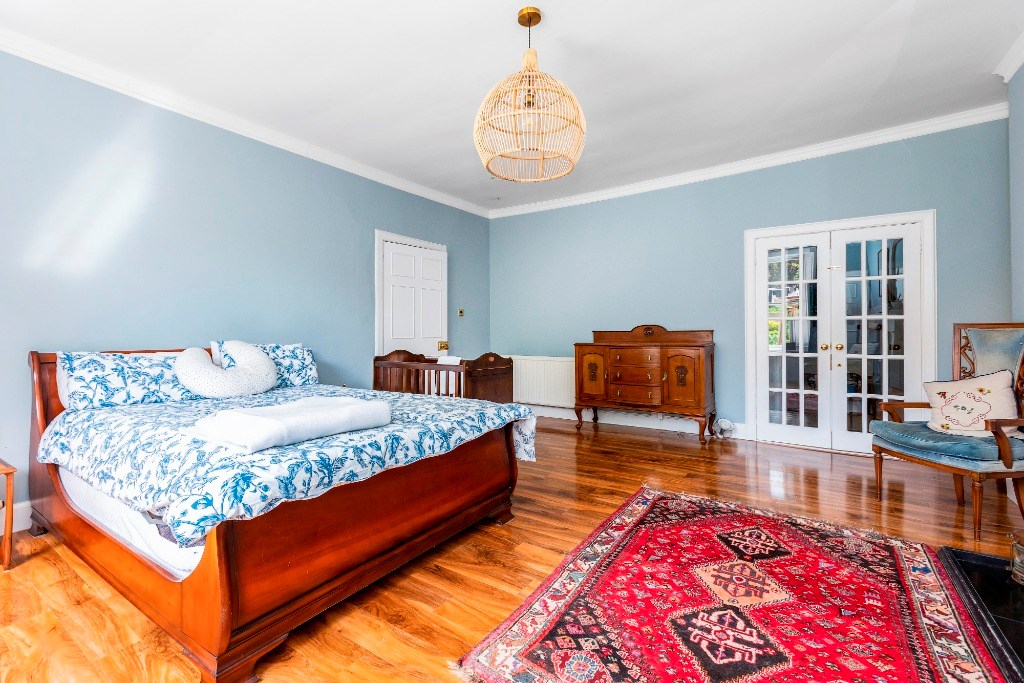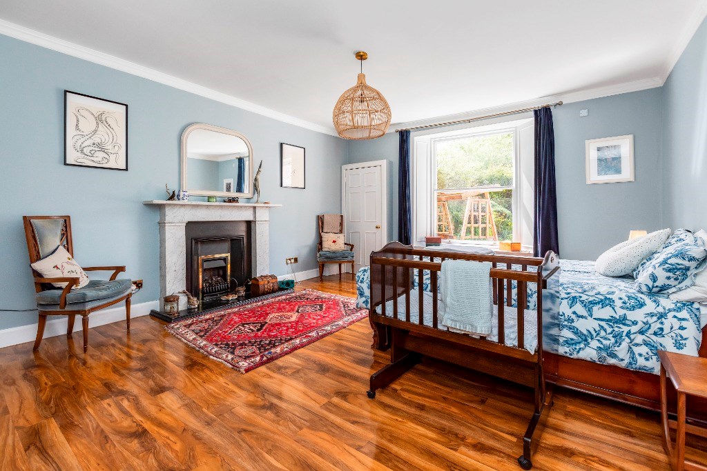 The main bedroom is brilliantly bright and spacious. It features two large sash and case windows, each with its own original wooden shutters. This room leads to a good-sized box room that connects the main bedroom to what has been designated as the living room. This has previously been used as a nursery, but it could just as easily be used as a home office or walk-in wardrobe space.