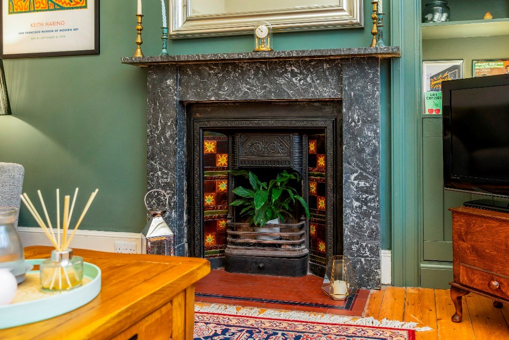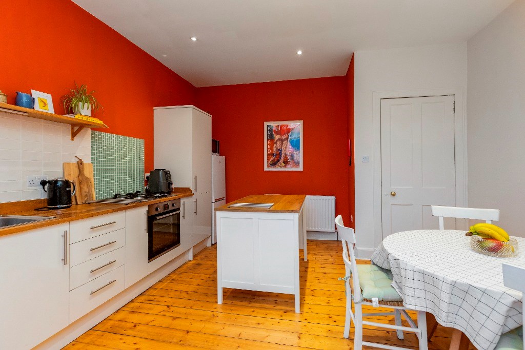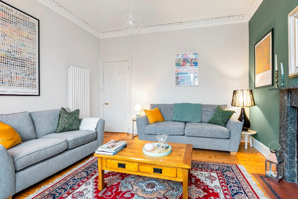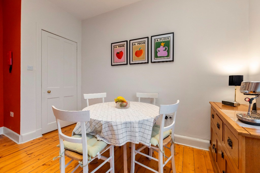 One of the highlights of this property is its extensive living spaces. The large living room has numerous period features. These include sanded wooden floors underfoot, ornate cornicing surrounding the high ceilings and a unique decorative fireplace as its centrepiece. An Edinburgh press in the container allows for storage. The tall sash and case windows also add to the traditional feel of this room, while allowing the evening light to flood in. The room (like the rest of the property) has been tastefully furnished. There are two large sofas (one being a sofabed to accommodate overnight guests) and an oak coffee table that will be included in the let.