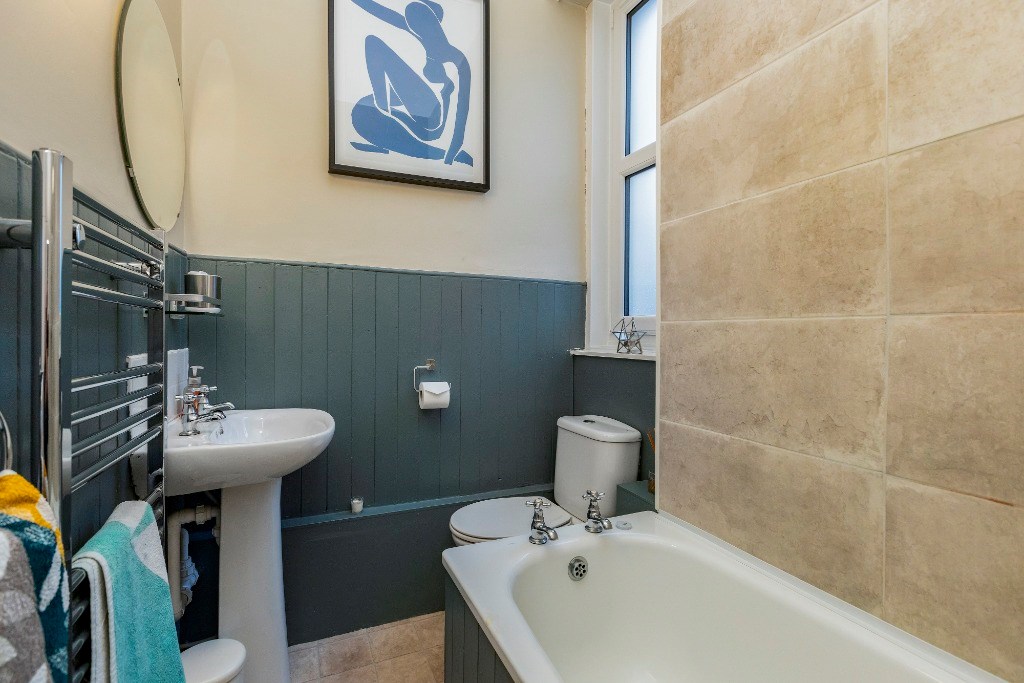 The bathroom has a shower over bath and a heated towel rail. There is effective use of painted wooden panelling on the walls and surrounding the bath.