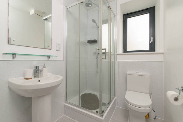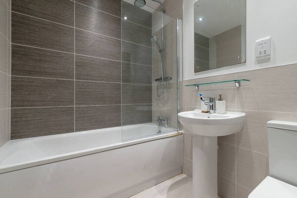 - Family bathroom with mains shower over bath and attractive tiled walls