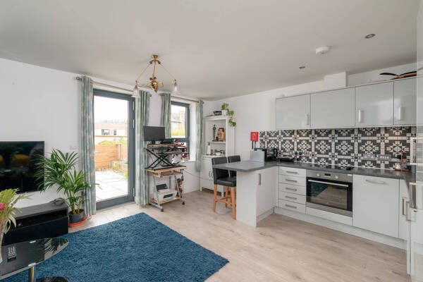 - Contemporary open-plan living/dining/kitchen area with laminate flooring and access to private front patio