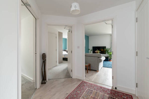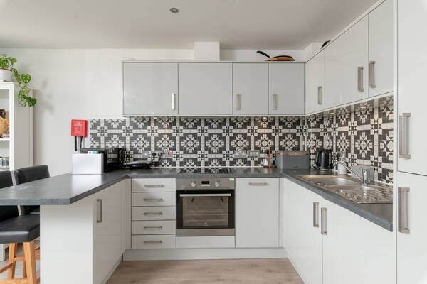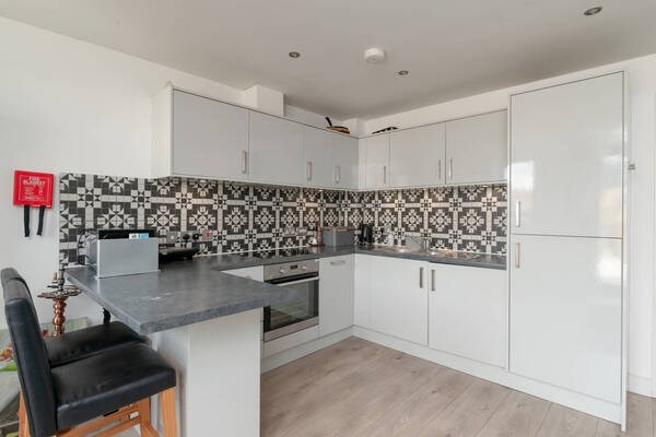- Modern and well equipped kitchen with integrated appliances (including dishwasher, washer/dryer & fridge/freezer), stylish worktops, tiled walls, wall & base units and breakfast bar