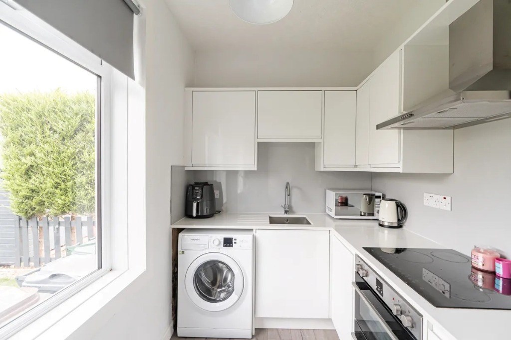 The property features a fully-fitted kitchen and separate living room with plenty of light, two good size bedrooms, a modern bathroom with shower and bath and easy ground floor access. Two large garden areas to the front and rear of the property ensure plenty of light and green outdoor space.