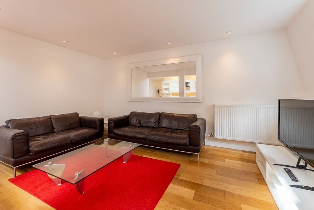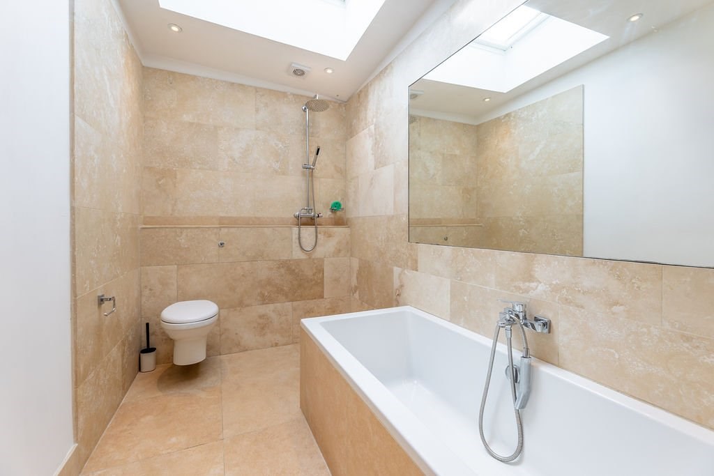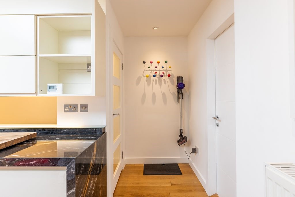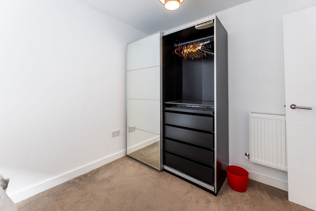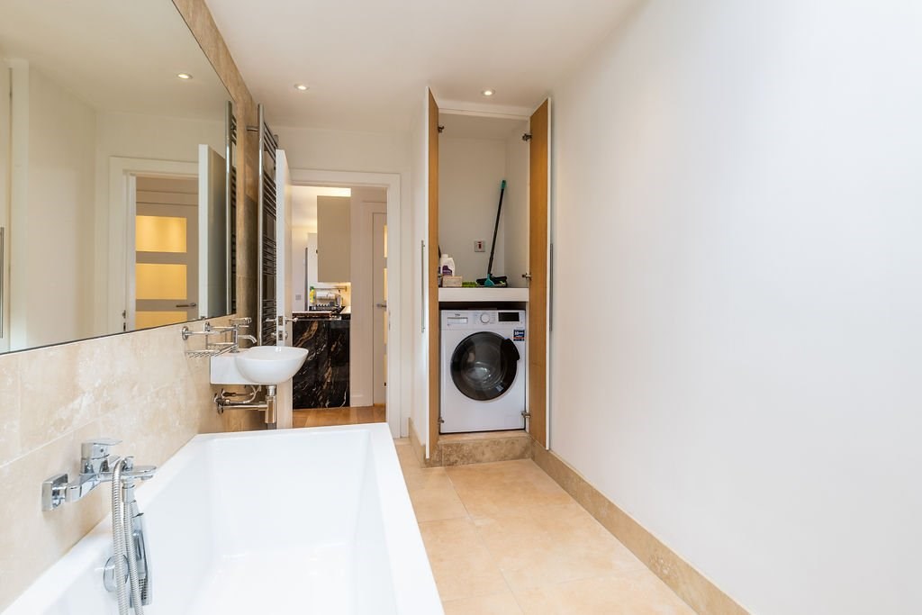 The bathroom is tastefully decorated in a contemporary style and features a separate bath and shower, a full wall-length mirror, and a heated towel rail. A hidden utility cupboard within the bathroom area houses a washing machine for added convenience.