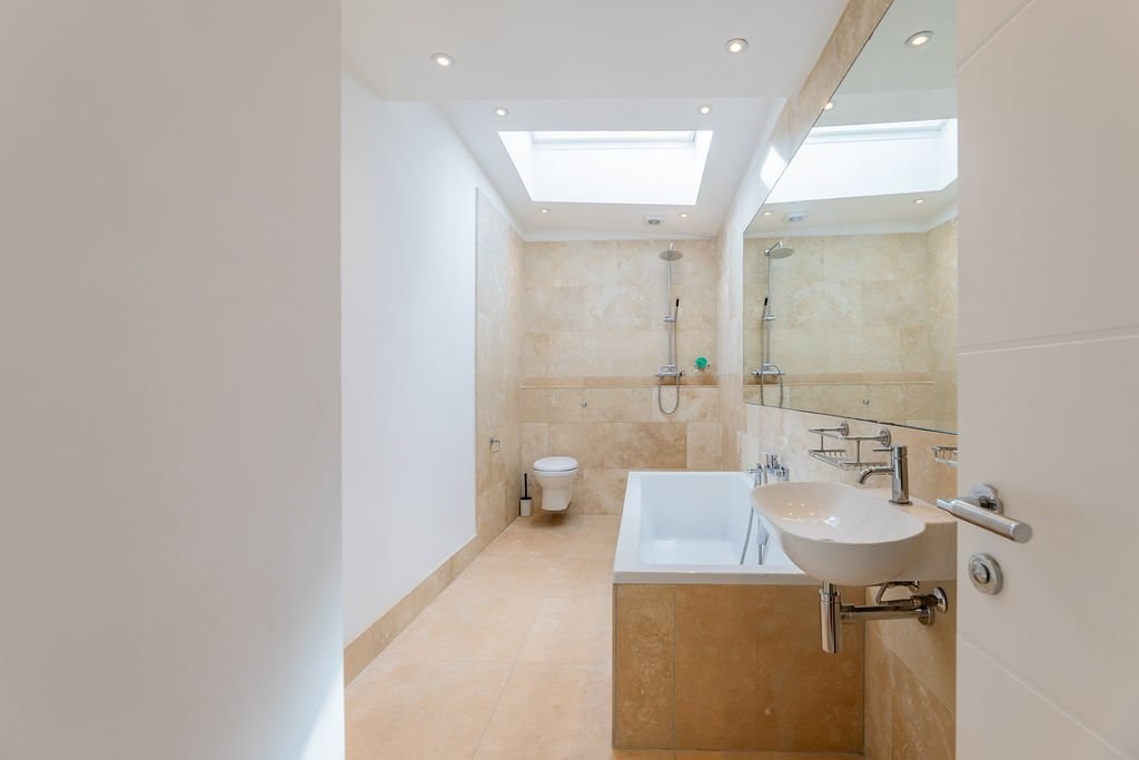 There is plenty of cabinet storage and space for a dining area, enhanced by a large ceiling window that brings in even more natural light. From the kitchen/lounge, sliding doors lead out to a private balcony, offering space for a small table and chairs or additional outdoor storage. Both bedrooms are comfortable doubles with space for free-standing furniture and benefit from well-sized windows that provide a pleasant flow of natural light.