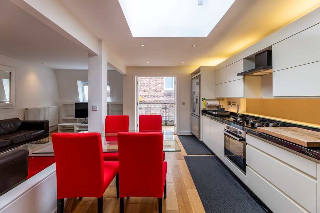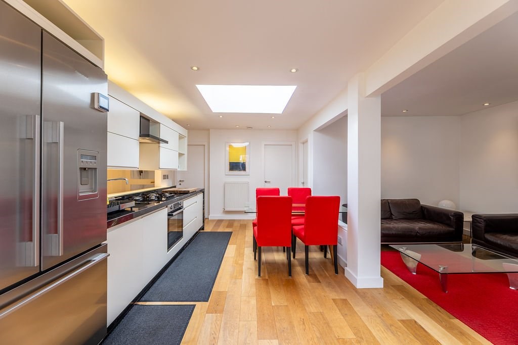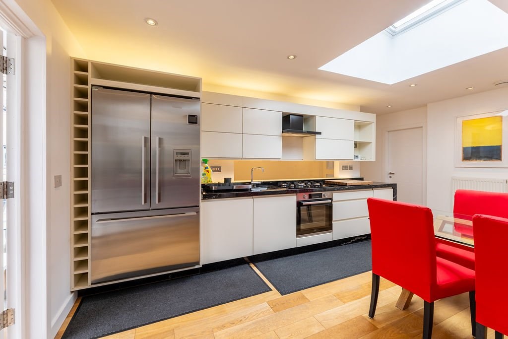 Wooden flooring runs throughout the main living space, complemented by skylights that fill the room with natural light, creating a bright and welcoming atmosphere. The lounge area includes a built-in entertainment unit with ample storage, perfect for modern living. Adjacent, the generous kitchen area is well-equipped with a double-door fridge freezer, dishwasher, and a high-quality oven with a sleek countertop hob.