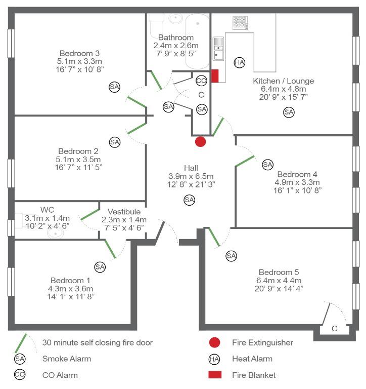 The accommodation comprises five good-sized double bedrooms, one with an en-suite shower room, a spacious fitted kitchen-lounge area offering ample storage and workspace, and a bathroom with an electric shower.