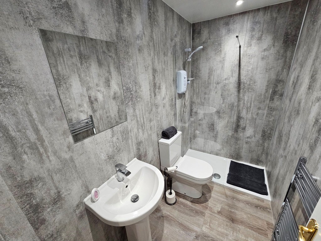 Open plan kitchen living room with full size fridge freezer, dishwasher and washing machine: Modern shower room: Double bedroom with storage.