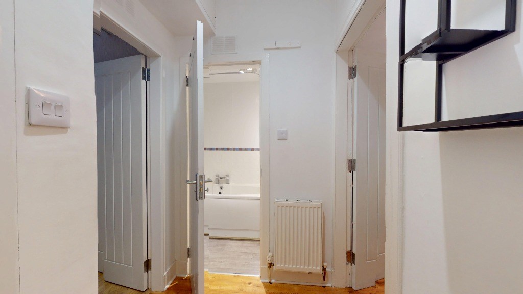Hall Entered from a wooden door with Mortice lock, this L-shaped hallway has neutral décor and attractive wood laminate flooring. There is a wall mounted security entry telephone and a high-level meter cupboard. Attractive wood panelled style doors and facia give access to the accommodation.