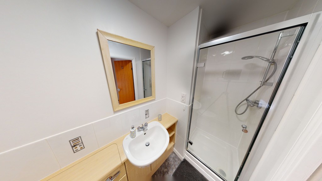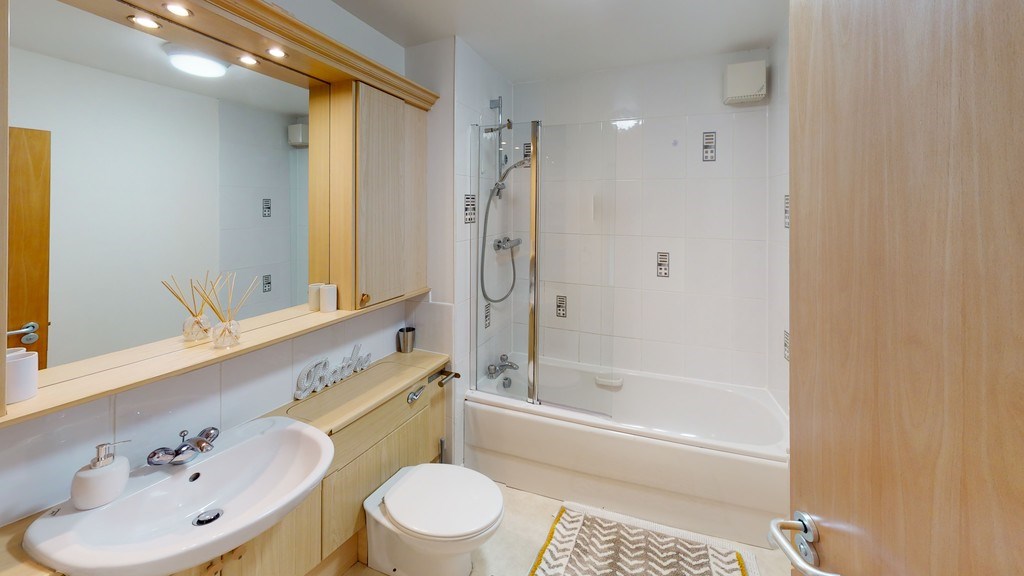 BATHROOM Stylish and modern bathroom with white three piece suite with shower over the bath. Benefitting from a large mirror vanity unit surround and neutral décor..