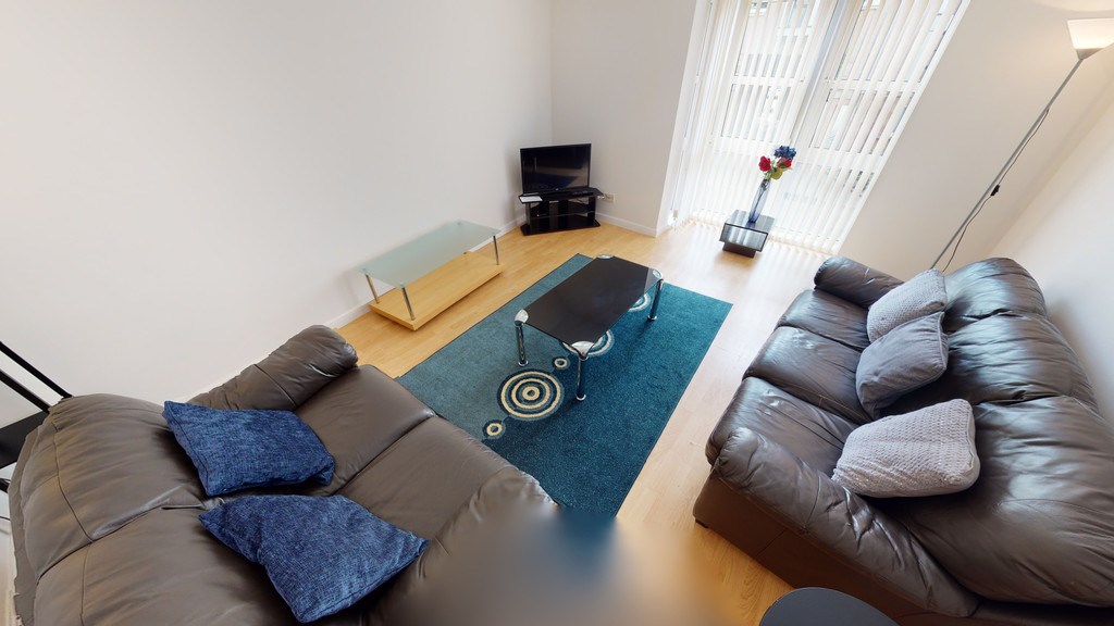 LOUNGE Instantly appealing and comfortably proportioned living area boasting a large window with corners which floods the room with natural light. This room includes everything you need from two leather sofas, square coffee table, side table, glass TV unit, making this space ideal for entertaining.