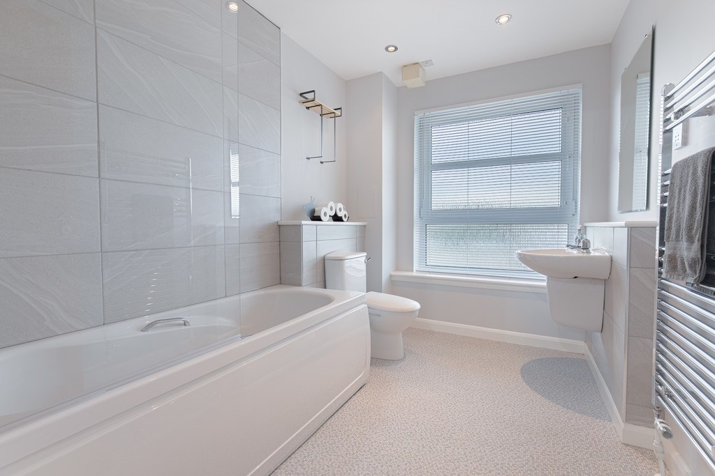 BATHROOM The main bathroom is generously sized and beautifully finished, offering a relaxing and practical space for daily routines. A large window floods the room with natural light, complementing the modern grey tiling and clean white fixtures. The suite includes a full-sized bathtub with overhead shower and glass screen, a wall-mounted wash basin, and a close-coupled WC. A chrome heated towel rail and built-in shelving provide additional comfort and storage.