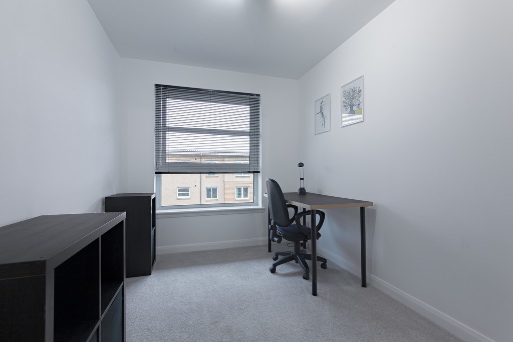 Currently furnished with a desk, chair, and shelving units, the room is well-equipped for remote working or studying. Alternatively, it can comfortably accommodate a double bed (upon request) and wardrobe for those needing an additional sleeping space.