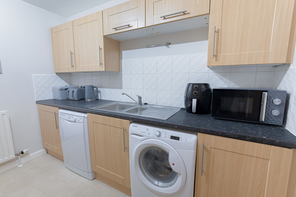 A built-in gas hob and electric oven sit neatly beneath an integrated extractor, with ample cupboard and drawer storage throughout. The kitchen also includes a washing machine, dishwasher, microwave, toaster, kettle, and even an air fryer, making it fully equipped for day-to-day living.