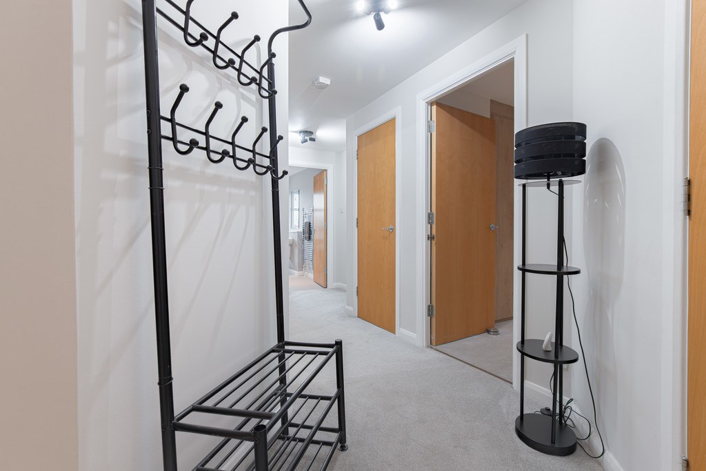 The hallway is well-lit with contemporary ceiling spotlights and benefits from multiple doors leading to the main rooms of the property, ensuring a practical flow throughout. A sleek black coat and shoe rack provides convenient storage, while a stylish standing shelf-lamp adds both function and a designer touch to the space. The hallway provides ample storage with three built-in closets, one of which contains a condenser tumble dryer.