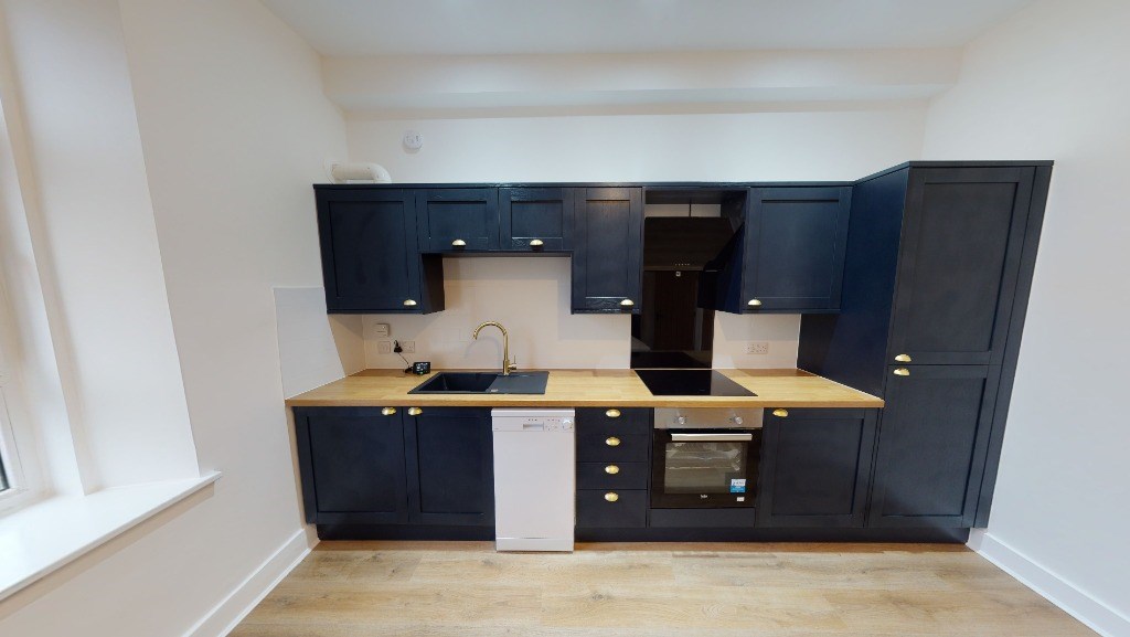 Large open plan kitchen living room with ample kitchen storage, dishwasher, washing machine and full size fridge freezer, the lounge area provides a 3 seat sofa and a range of side tables: Modern shower room with under sink storage: Large bedroom with built in wardrobes, king-size bed and a range of matching bedroom furniture.