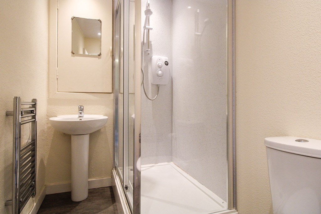 BATHROOM Modern newly fitted three piece white suite with double shower cabin.