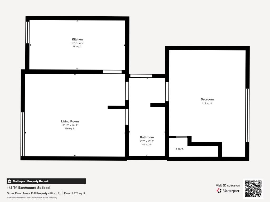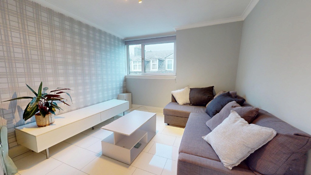This well-designed one-bedroom apartment in Aberdeen maximizes its 388 sq. ft. floor space with a practical and modern layout. The open-plan living area serves as the heart of the home, featuring a comfortable seating arrangement with a grey sofa and a turquoise accent chair. Light-coloured tile flooring throughout enhances the sense of space and brightness.