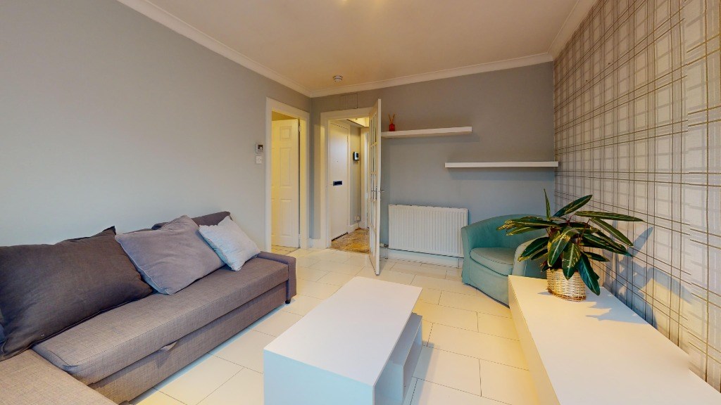 Throughout the apartment, a neutral colour palette of whites and greys creates a calming atmosphere, with occasional pops of colour in furnishings and décor. The property benefits from modern amenities such as central heating, as evidenced by the radiators in various rooms. Overall, this apartment presents a thoughtful balance of style and functionality in a compact urban living space.