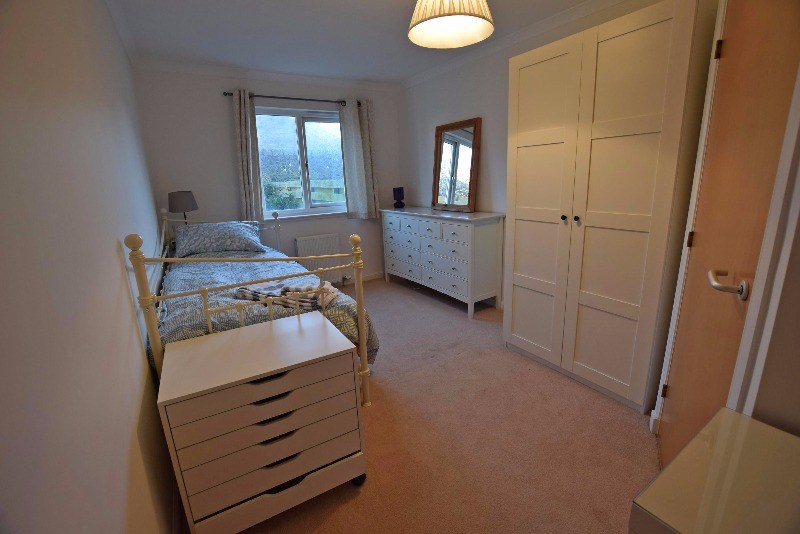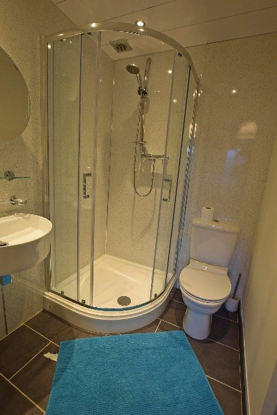 BEDROOM 3 – Bright and airy carpeted double bedroom with large picture window overlooking the rear of the property. TV point. Radiator. Door to EN SUITE SHOWER ROOM with white suite, large shower cubicle, and fully aqua panelled walls.