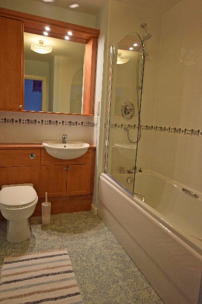 BATHROOM – Large family bathroom with modern three piece white suite and overhead shower. The wash hand basin has been set within a vanity area with ample storage cupboards and finished with illuminated mirror and display shelf. Fully tiled shower area and behind sink. Radiator.
