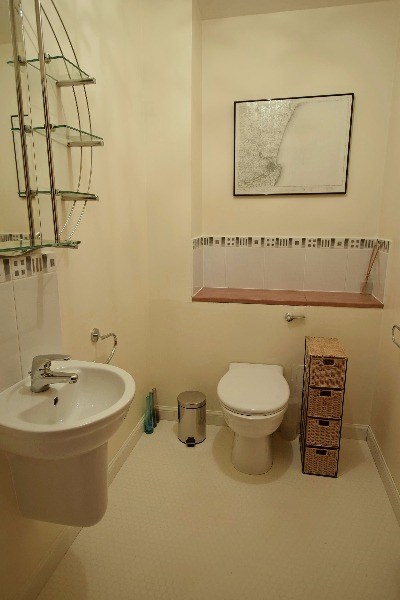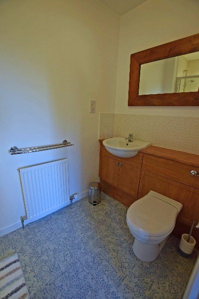 CLOAKROOM – Two-piece suite comprising of a WC and wash hand basin with wall mounted mirror and display. Radiator.