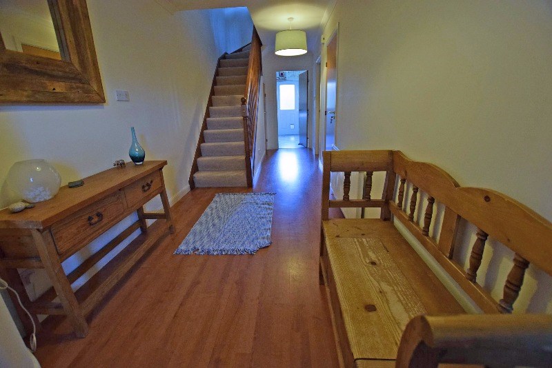 ENTRANCE HALLWAY – Large hallway which allows access to the integral single garage, utility room and en suite double bedroom. The built-in cupboard houses the meter, and has coat hooks. A further under stair cupboard provides excellent storage facilities. Telephone point. Radiator. Laminate flooring.