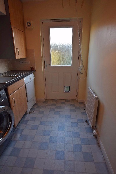 UTILITY ROOM – Room to rear of property incorporates storage base units, contrasting work surfaces, splash back tiling and stainless steel sink/drainer with mixer tap. Washing machine and tumble dryer. Sheila Maid. Linoleum flooring.