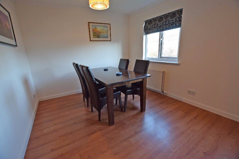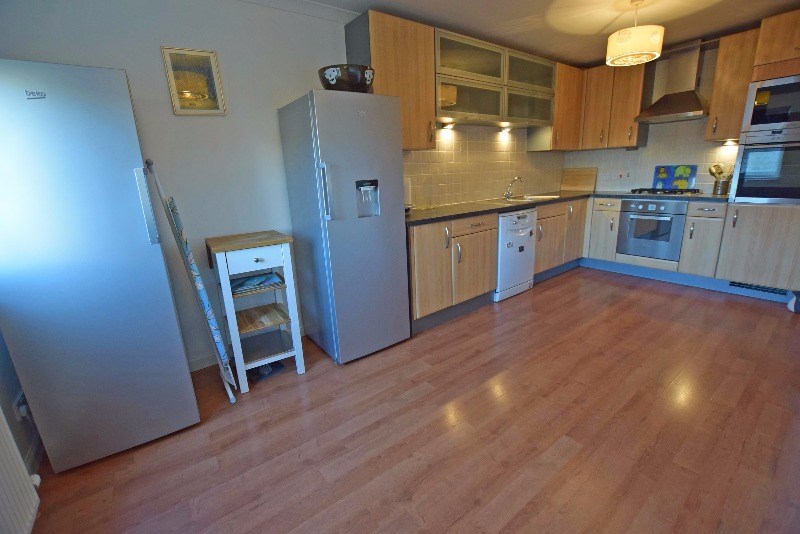 DINING KITCHEN – Large room at the rear of the property, tastefully fitted with a modern range of base, wall and frosted glass display units. Contrasting roll front work surfaces incorporate the stainless steel sink/drainer with mixer tap, and finished with splashback tiling and under unit lighting. Fridge, freezer, dishwasher, gas hob, built in electric ovens. Large dining space perfect for family dining or entertaining. Laminate flooring. TV point; Radiators.
