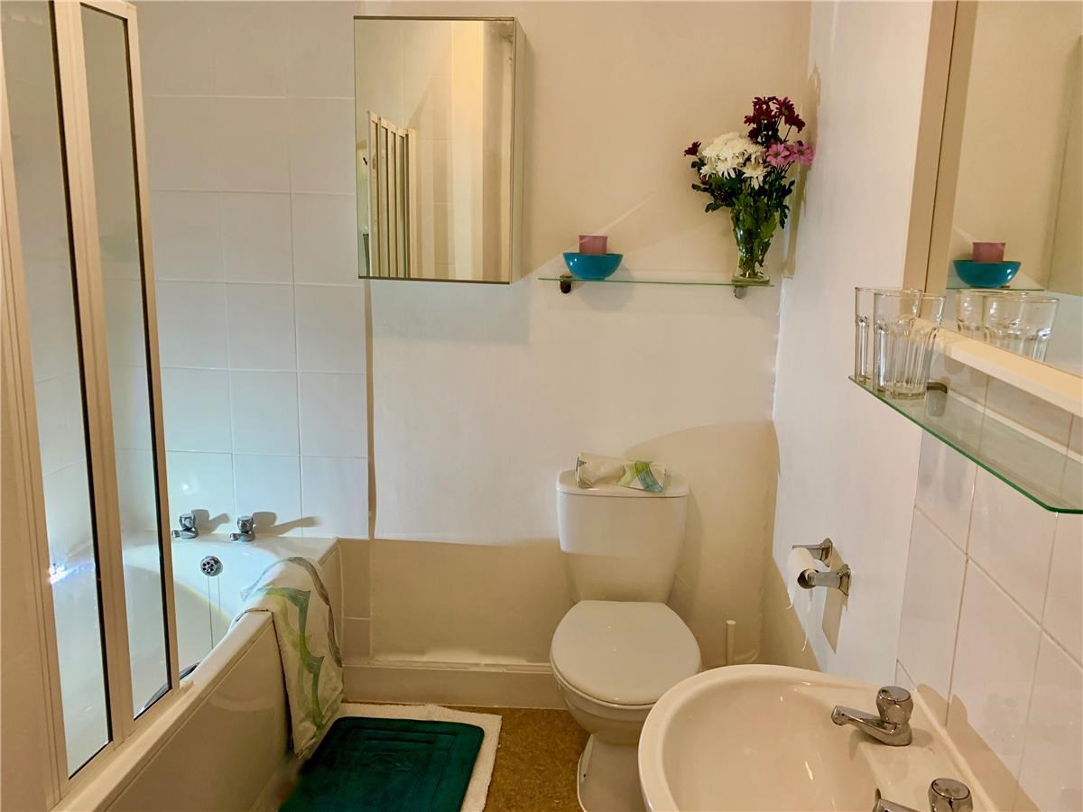 The property features two spacious double bedrooms, small living / office space, well-equipped kitchen with a small dining area and internal bathroom with white ceramics and a shower over the bath.