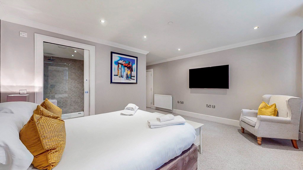 The spacious double bedrooms offer plush bedding, ample wardrobe space, and calming d'cor designed to ensure a restful night's sleep. The bathroom is equally impressive, featuring a modern walk-in shower, elegant tiling, and luxury toiletries for added comfort.